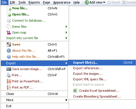 Export references- launches the Export files dialog with the export file type already set to the single column .TXT file format. The wizard allows you to specify the field and records (by universe) from which to generate an exported a list of references. Export the images- launches the Export files dialog with the export file type already set to a folder of images. The wizard allows you to choose which associated image set you wish to export and to set re-sizing limits on individual picture size to limit the maximum size of the images exported to the folder. Note: Omniscope files make excellent image catalogues. You can view and filter a collection of images, put selected images in the Basket, then export them as a new collection to a folder for re-use. Export XML query- launches the Export files dialog with the export file type already set to XML Query. This allows you to export your current filter settings (query) or any other named query as a small, portable text file that others (such as database administrators, customers, etc) who have the same Omniscope file can load the query file and instantly focus their display on the exact sub-set of records corresponding to your exported query. Export back to source- will overwrite the linked data source file (but not a relational database table/view) with corrected/edited data from the Omniscope file. Create Excel spreadsheet- creates a new Excel spreadsheet containing the fields (cxolumns) and data subset you specify. Note that if you want to paste data from Omniscope into an existing Excel spreadsheet, you can also use copy/paste. You must have Excel installed to use these features. Create Bloomberg spreadsheet- creates a new Excel spreadsheet including imported, automatically refreshing Bloomberg fields i.e. source files that can update in real-time. Professional and Enterprise Editions only. You must have Bloomberg access and Excel installed on your PC to use this feature. For more information, see Working with Bloomberg. PrintingSave screen image- Exports the current screen display in a range of image file formats (.JPG, .BMP, .GIF, .PNG, .WBMP) suitable for pasting into other applications. Also provides an option to copy the image directly to the clipboard for re-use. Print screen- Sends the current screen display to your printer as an image. Print page- for more detail on Printing, see Printing options Print as PowerPoint- for more detail on Printing, see Printing options Print as .PDF- for more detail on Printing, see Printing options Close & ExitClose- closes the current Omniscope file. Opening a new Omniscope file will automatically close the Omniscope file currently open. You will asked if you want to save your changes first. Exit- Exits the Omniscope application (but not the Enterprise Edition Scheduler or Generator, which are autonomous applications intended to be run on always-on servers). You will be asked if you want to save if you have made changes to data or view configurations, but neither closing nor exiting will commit changes to Report Pages. The file will next open with the Report Page tabs in red, indicating that you have to either commit the changes or revert to the original configuration of the Report Page.