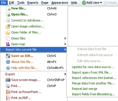 The Open Map command reveals available maps already downloaded, the default world map, the option to download additional standard Visokio maps, and the option to browse for and import/embed an image or customised map file for use as a backdrop with a derived coordinate grid. Recognised map file types for import and embedding include Image (.JPG, .PNG, .GIF, etc. depending on your version of Java), files, plus (Visokio) .MAP, .VEC, and .ILF files. Whether you download a standard map or import a customised map, the next display will be in the Map View. For more information on using geographic coordinate systems with Visokio maps and customising co-ordinate systems for use with imported images such as floor plans or sports fields, consult the Knowledge Base section on Maps & Coordinates. Import sub-menuImport into current file - This command reveals a sub-menu containing options for refreshing data from linked sources, administering the data sources linked to a specific file, importing XML query files to recreate record selections sent by others, importing single column lists of references sent by others as .TXT files for matching, merging in (or repeating the merge of) additional columns or rows of data from other .IOK or .XLS/.CSV data files (see using the Merge Data wizard), and importing/refreshing fields from Bloomberg (Professional & Enterprise Editions only, assuming you are running on a Bloomberg-connected PC).