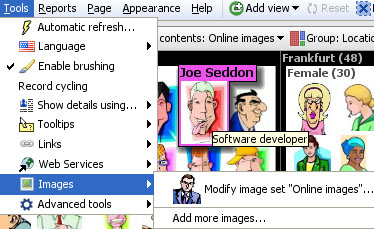 Omniscope is a 'hybrid' web/desktop application that is easy to integrate with Web Services. In addition to the preconfigured free web services (that accept a single value text string input) available on the Links menu, there is also a useful multi-record submit Web Service via HTTP POST available in Omniscope. The Tools > Web Services dialogs permit you to configure and edit Web Services that expect multi-record input to work seamlessly with your Omniscope files. Accepting the defaults under Add web service will configure an 'echo test' service (hosted by Visokio) in which our server repeats back a list of references you have selected in your local Omniscope file. More information on configuring and using web services with Omniscope is available in Tools > Web Services and the Web View subsection on using Web Services. Tools > ImagesBefore you can display images, you must associate one or more folders of images with the .IOK file as a named image set. Preparation for this involves saving a set of images in a single folder with a consistent naming convention, such that the same text values are present in one of the columns of your .IOK file (it may be a column included just to hold the names of the images). It is also possible for Omniscope to display multiple images per record, provided you have entered multiple 'tokenized' values in the image reference cell. There are 3 ways to display image sets in Omniscope: