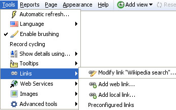 2.4 Tools MenuTools Menu commands (2.4)Useful settings and options to add more to your filesApplies to 2.4 only; most of these options are now on the Settings Menu 2.5 The Main Toolbar Tools menu and sub-menus group together commands and options for managing data refresh, language settings, 'brushing' or fading of unselected records, display of individual record-level details, links to related content and services outside the file, associating image sets with the file and many advanced configuration options.