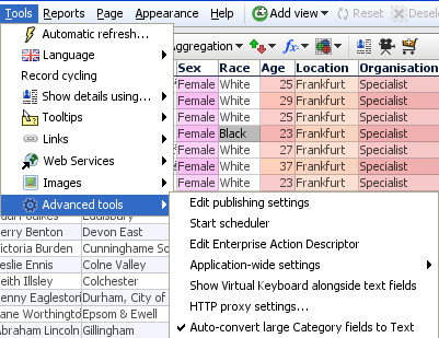 Language selector - choose from the list of available translations Use system language setting - tick this option to start Omniscope with the language setting specified in the operating system. If a user selects a different language, it will override and untick this setting. That user's installation will open using the preferred language until reset using this command. Edit translations - opens your local copy of the embedded EditedLanguages.iok translation file. You can make changes to the translations text in this file, being careful to follow the Guidelines in the Translations Guide. When you have finished editing, choose File > Save (not Save As) to save the edited file in its original location. In Tools > Languages, ensure your edited language is selected, then close and re-start Omniscope to see the changes you made via the edited file. Use local translations file - if you open the embedded EditedLanguages.iok file to make and save changes, this option will be ticked. To revert to showing the default translated text, untick this option and restart Omniscope. Submit edited translations - if you would like your translations/edits to be included in the default for a given language, or added to the menu as a new language or variant, submit your EditedLanguages.iok file to us using this command. Tools > Advanced toolsAdditional Tools sub-menus are available from the Advanced Tools menus. Note: Some of these commands are only available in the Enterprise Edition.
