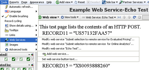You specify links and make them available for use within your Omniscope file using the Add web link, Add local link and Preconfigured links dialogs. For more information, see Tools > Links. Tools > Web ServicesWeb Services are data processing services that use Internet standards to post data to a remote server, which usually delivers a response in web page format. Popular examples of Web Services in action include submitting text to a search engine and receiving the results page, or submitting stock tickers to view price charts. (definition of Web Services).